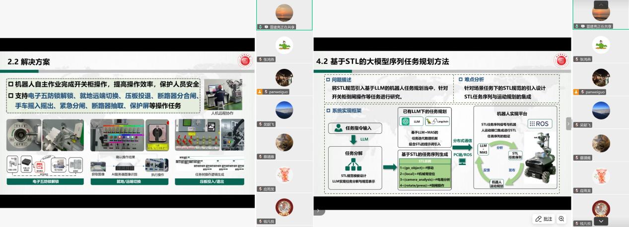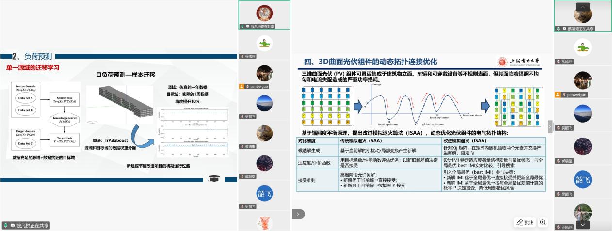 会议邀请三位教师代表分享前沿研究成果,展现团队在低碳能源、AI+能源领域的技术突破。针对传统光伏组件适配复杂曲面难的问题,蔡靖雍副教授建立了多尺度多物理场模型,揭示了曲面光伏辐照分布规律,优化了组件串接结构,开发的“曲面光伏-通风幕墙-热泵”复合系统,为建筑光伏一体化、应急能源场景提供新方案。钱凡悦博士后聚焦需求侧能源系统精细化调控,引入迁移学习技术,解决分布式能源系统数据稀缺、个性化差异大的痛点。通过优化算法与模型,大幅提升负荷预测精度与故障诊断效率。针对电力巡检安全风险高、效率低的问题,冒建亮副教授研发了变电站双臂移动机器人与输电线路爬行机器人,集成视觉定位、强化学习等技术,攻克复杂操作难题,已在南方电网示范应用,并亮相2025年世界人工智能大会,为“机器人+能源”战略落地提供技术支撑。