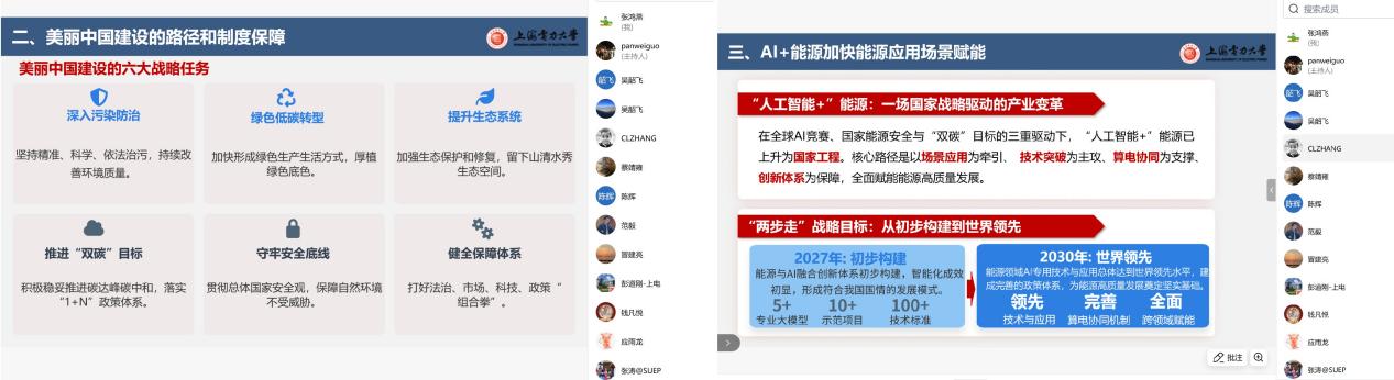 会议首先由吴韶飞老师领学《求是》杂志发表的习近平总书记重要文章《在全国生态环境保护大会上的讲话》,重点解读生态文明建设“四大转变”与“五大关系”。文章明确我国已进入加快绿色化、低碳化高质量发展阶段,其中“多污染物协同控制”“绿色低碳转型”等要求,与团队“高效低碳发电”核心研究方向高度契合,为技术研发提供了战略指引。同步学习的国家能源局《关于推进“人工智能+”能源高质量发展的实施意见》,明确“人工智能+”能源高质量发展上升为国家工程。同时人工智能+能源新业态、+新能源、+火电等方向与团队研究紧密相关,为科研选题提供了国家战略层面的清晰导向,也为后续技术攻关划定了重点领域。