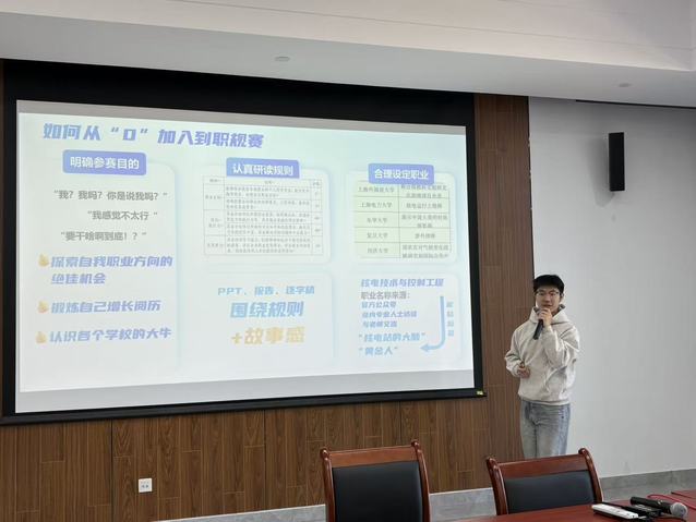 本次赛事特邀我校上一届全国总决赛金奖得主李威鸿同学担任评委,与学院党委副书记涂莹亮、全体辅导员共同组成院赛评审团。赛前,李威鸿结合自身斩获全国金奖的备赛经历与职业发展心得,向参赛学子分享了实用备赛技巧,强调“职业规划要像机械齿轮一样环环相扣”。他还现场演示了参赛答辩 PPT 的优化方法,为学子提供了极具针对性的指导,助力大家精准打磨参赛作品。